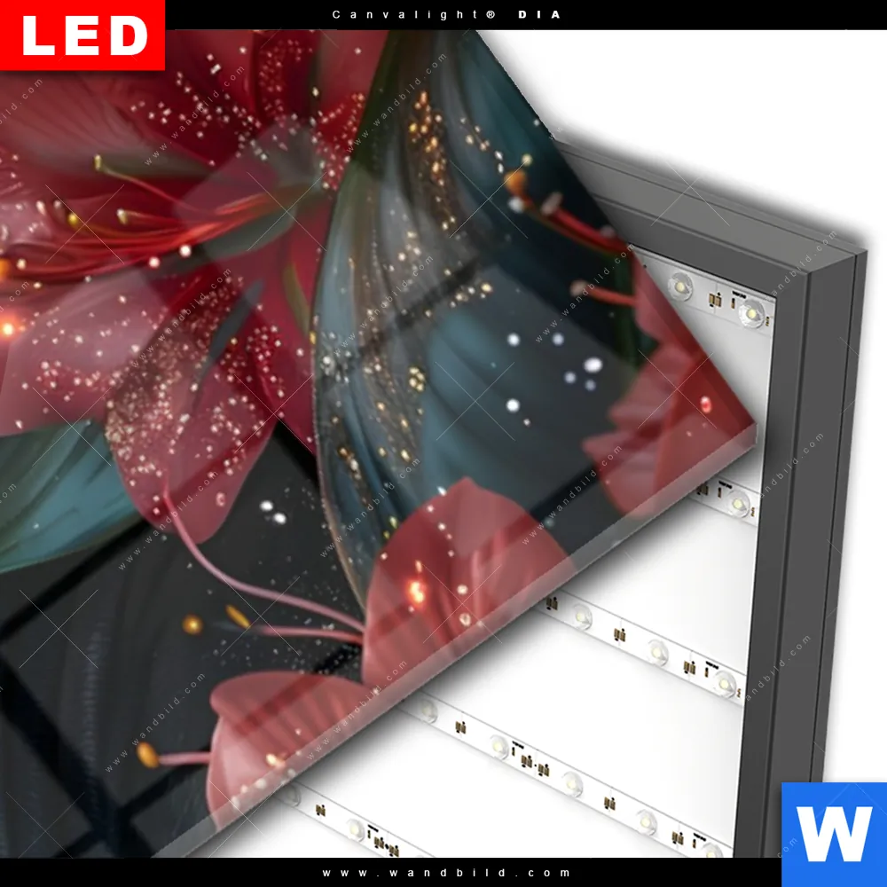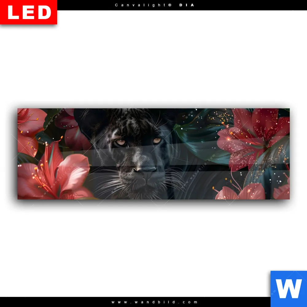Wechselmotiv Acrylglas Canvalight® DIA | Panther und rote Blüten | Panorama