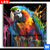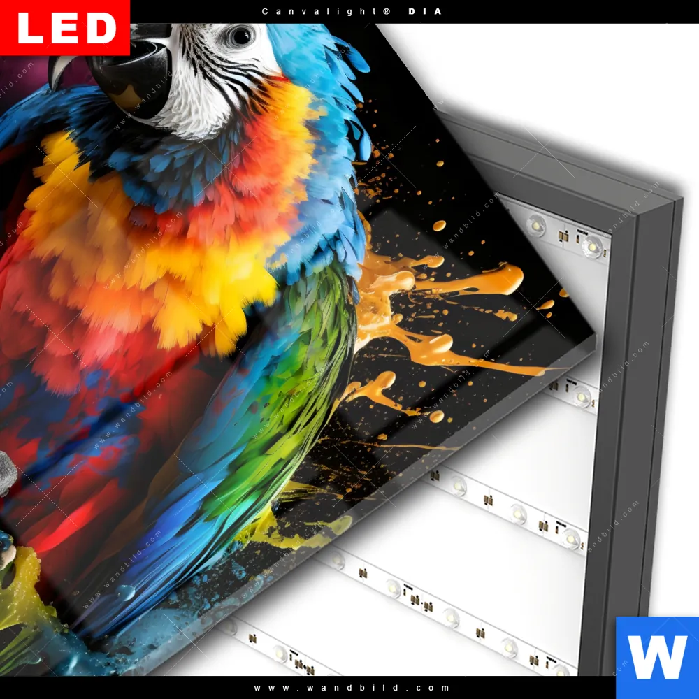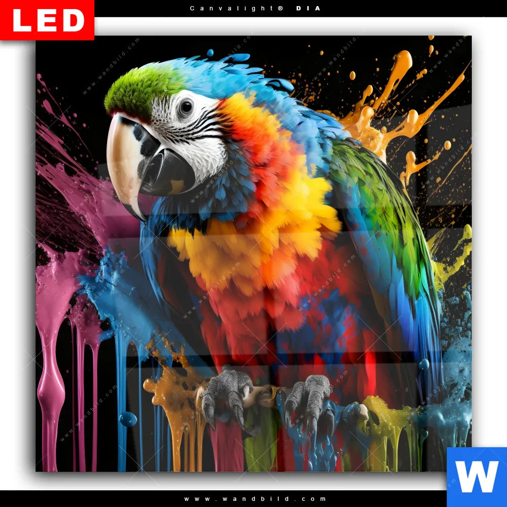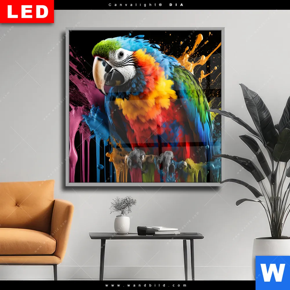 Wechselmotiv Acrylglas Canvalight® DIA | Papagei mit bunten Farbspritzern | Quadrat