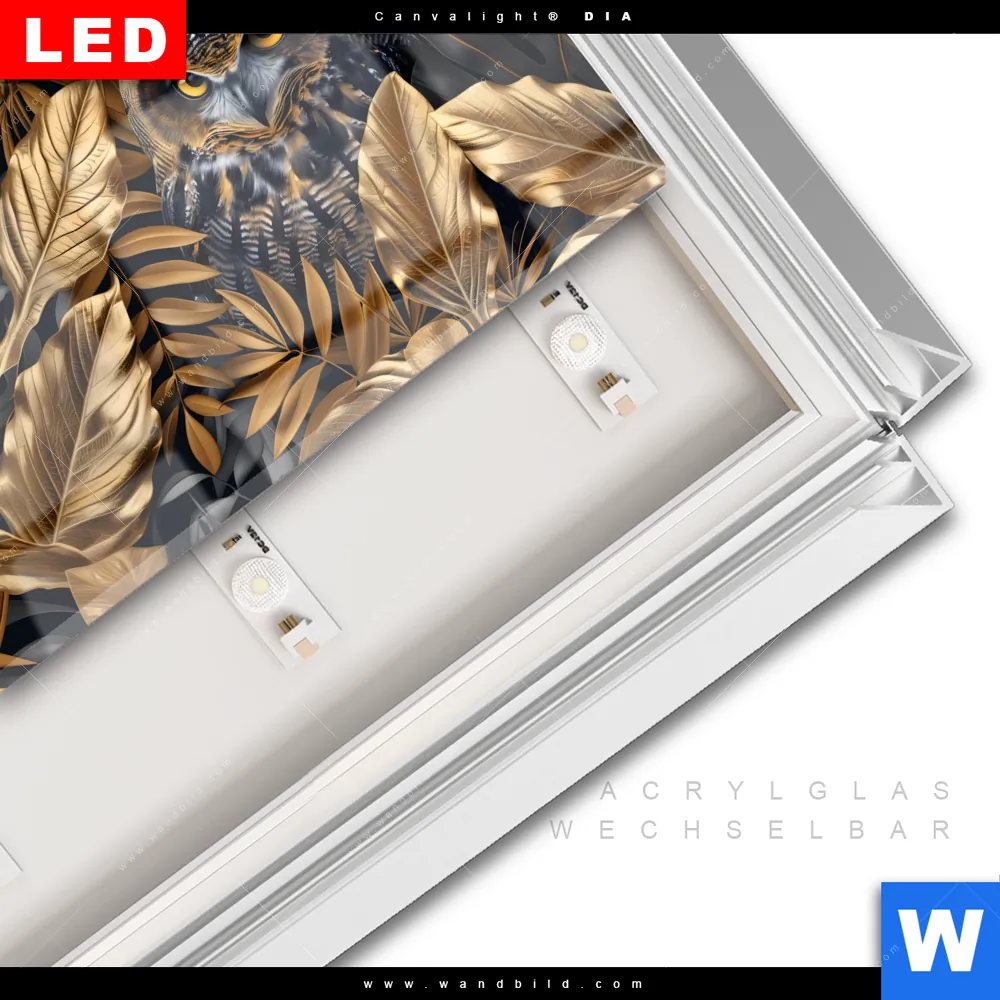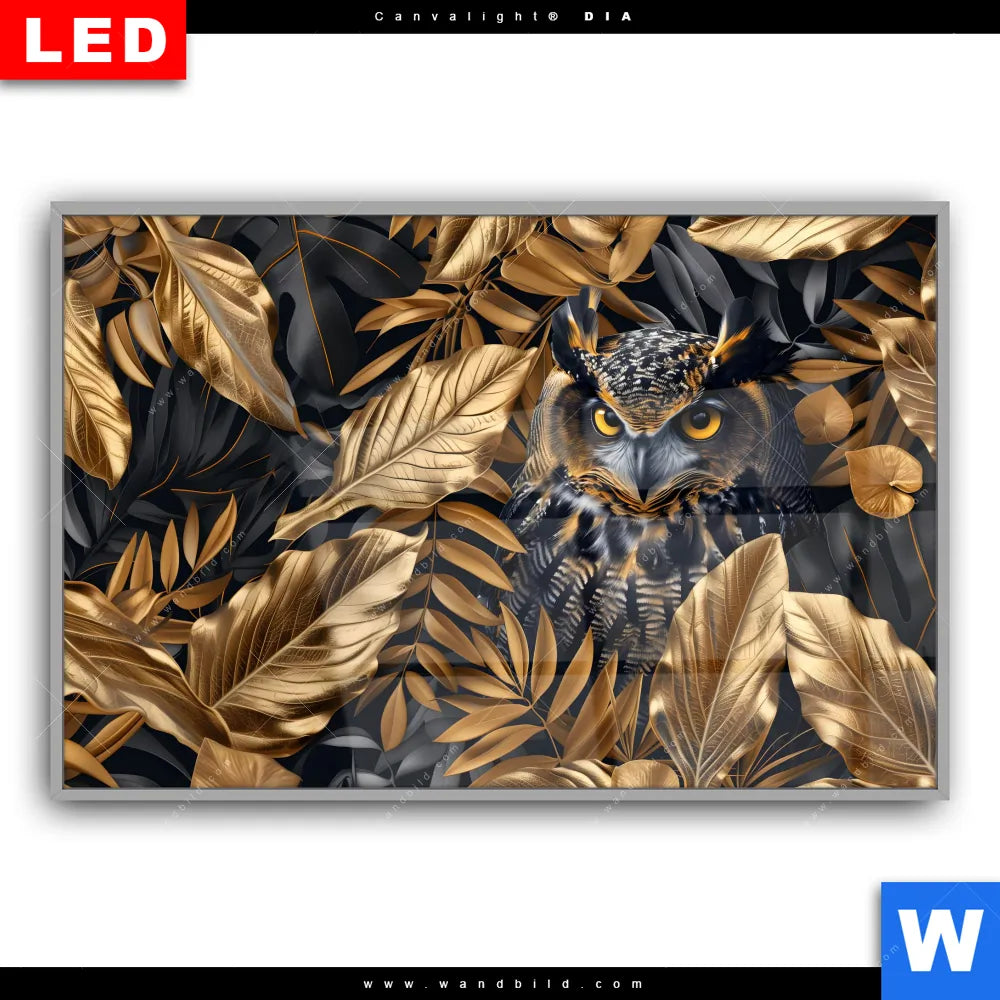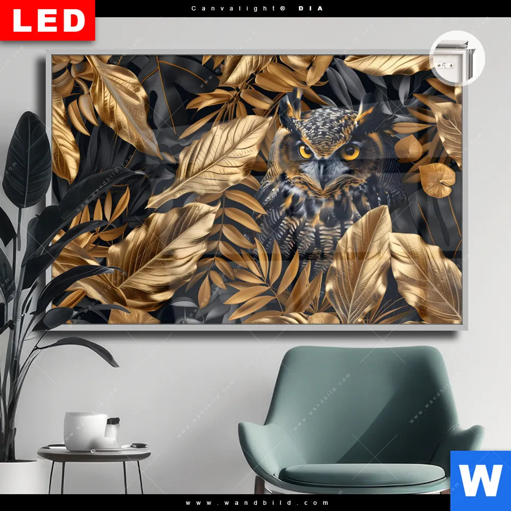 Leuchtbild Acrylglas Canvalight® DIA | Eule und goldene Blätter | Querformat