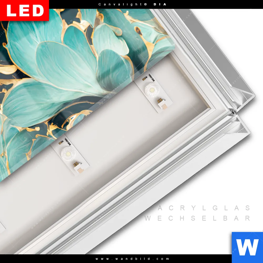 Canvalight® DIA Leuchtbild | Marmor Blüten in türkis & gold | Hochformat