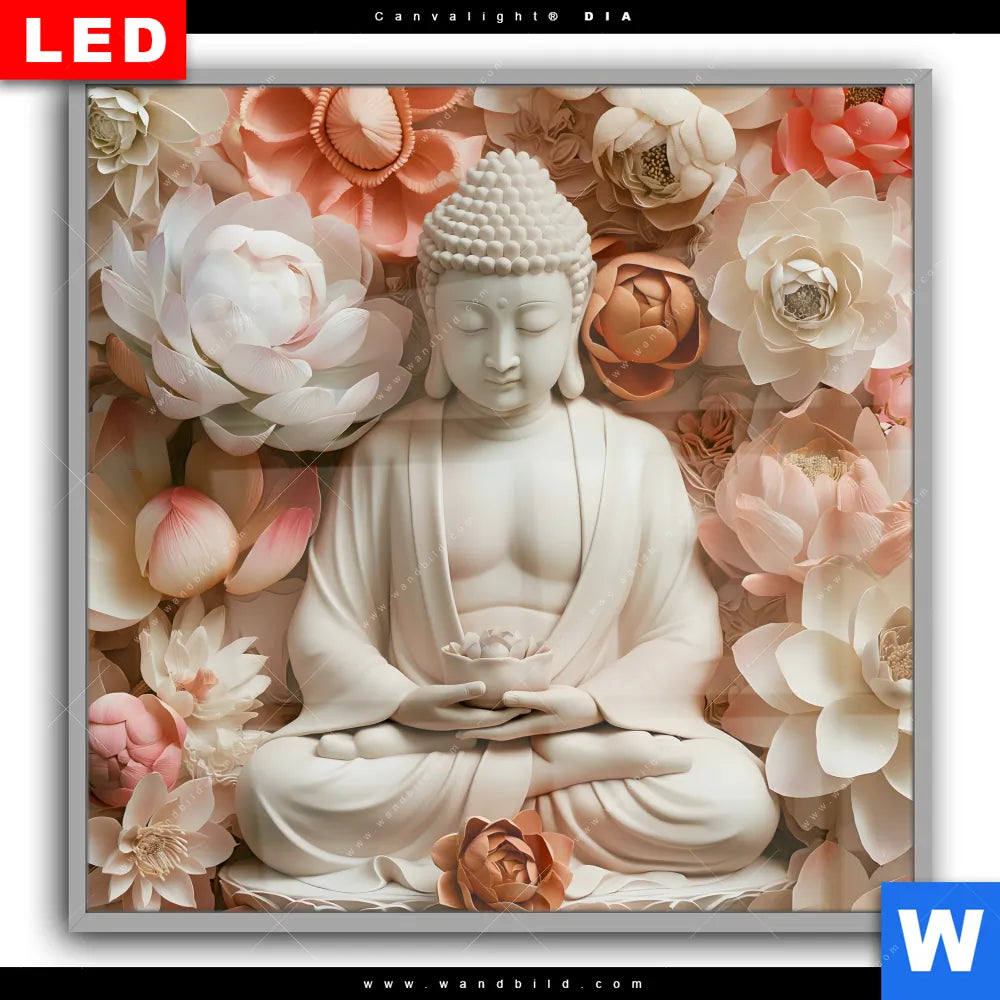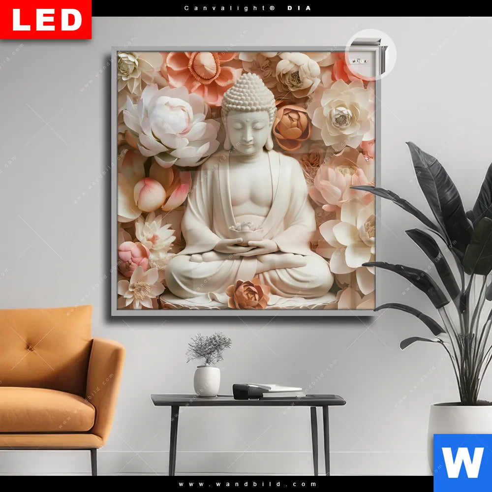 Canvalight® DIA Leuchtbild | Meditierender Buddha mit Blüten | Quadrat