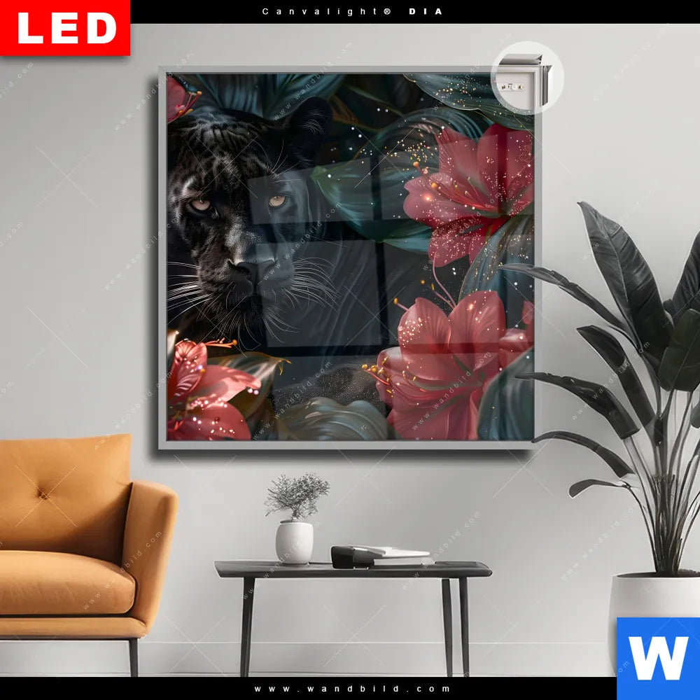 Canvalight® DIA Leuchtbild | Panther und rote Blüten | Quadrat