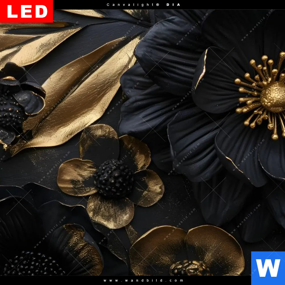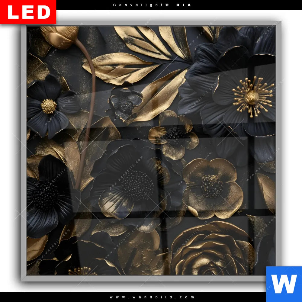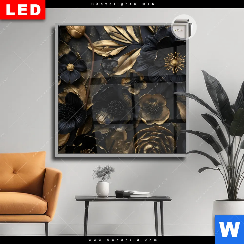 Canvalight® DIA Leuchtbild | Schwarze und goldene Blüten | Quadrat