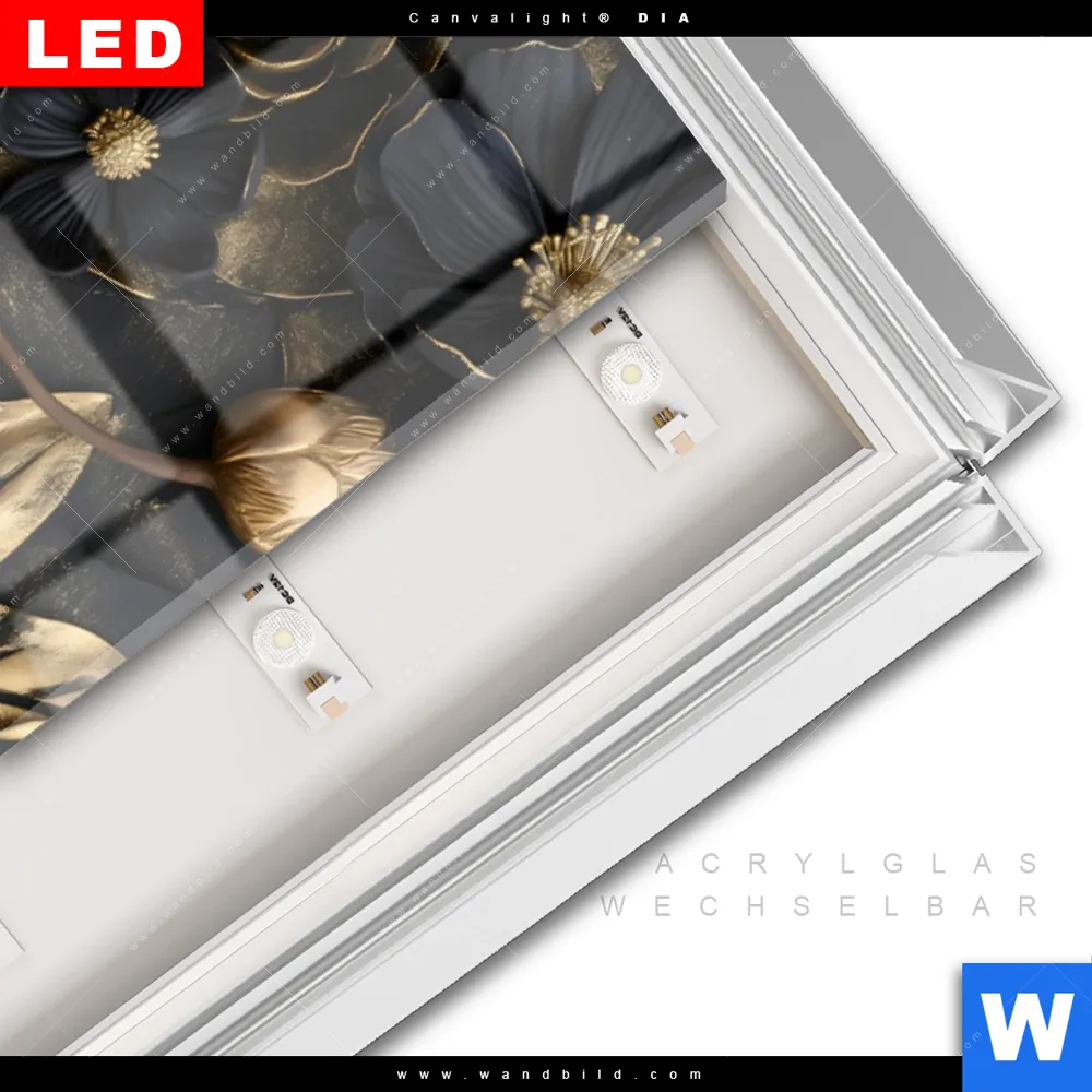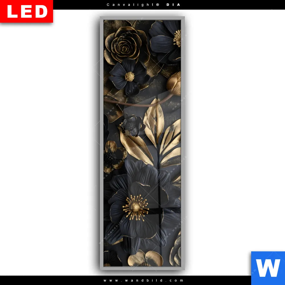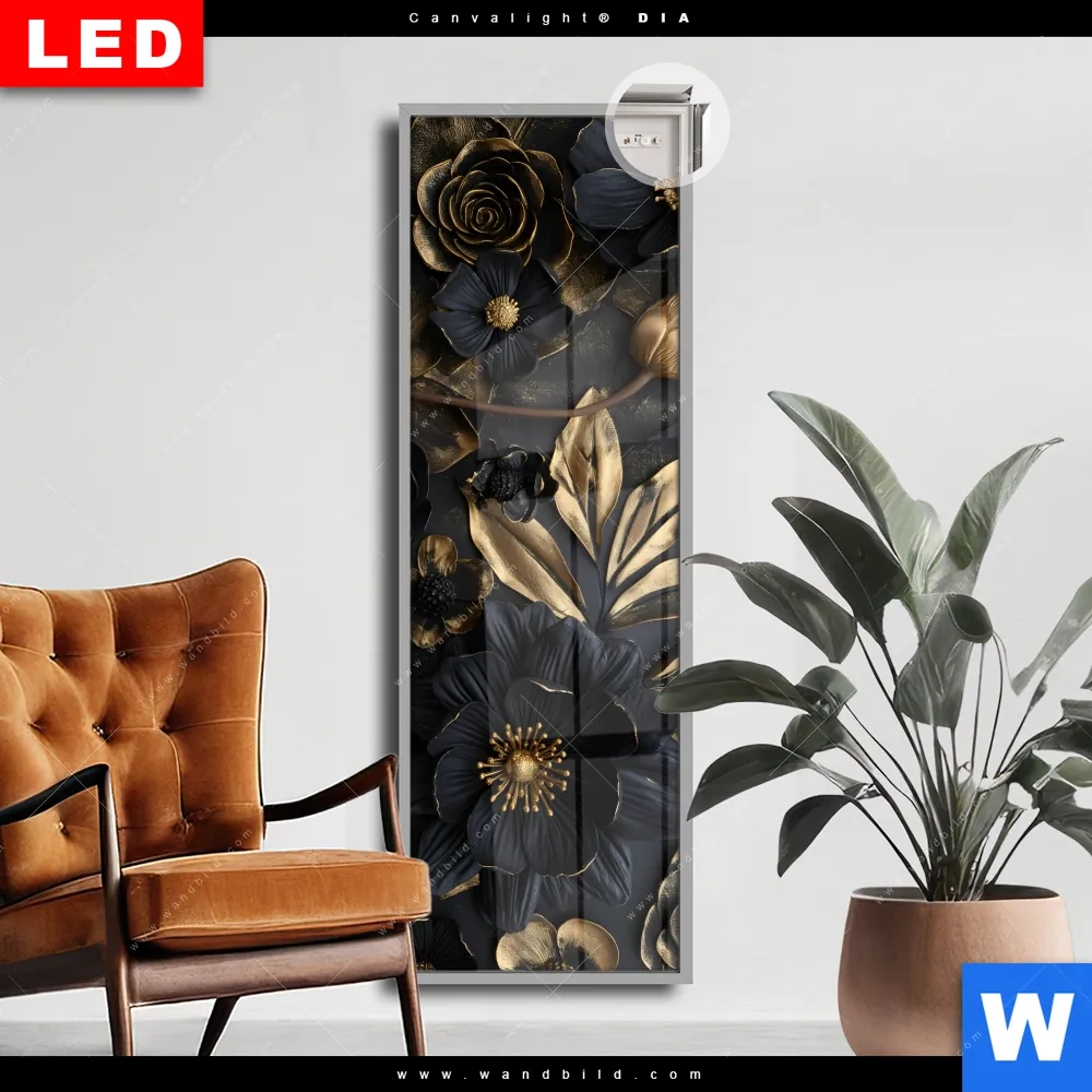 Canvalight® DIA Leuchtbild | Schwarze und goldene Blüten | Schmal
