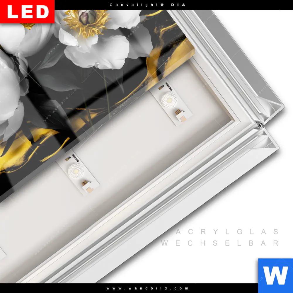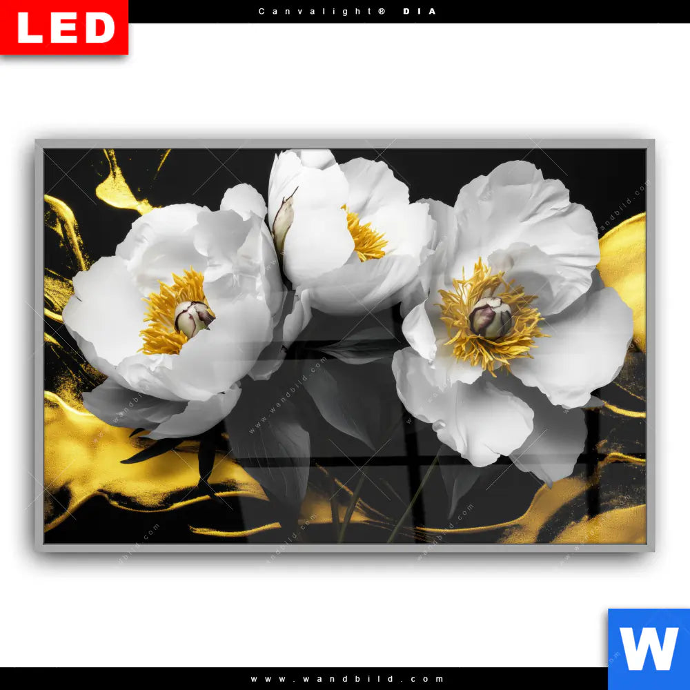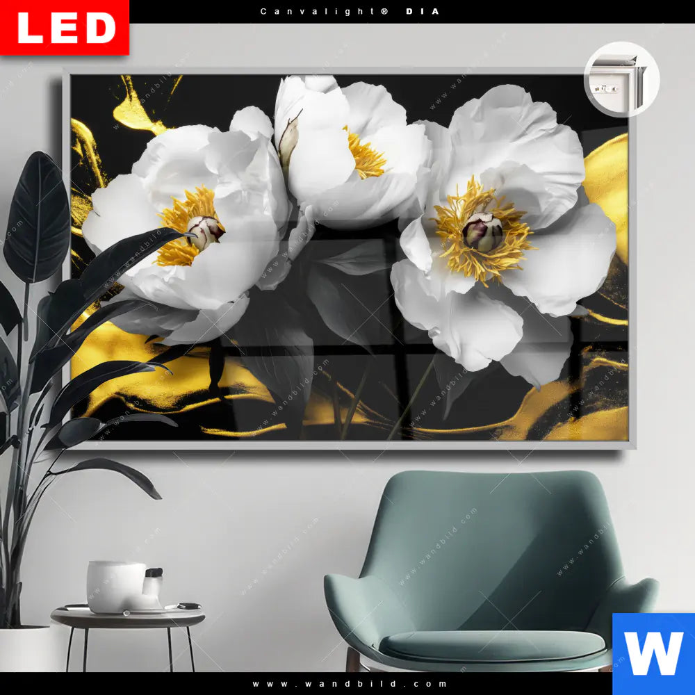 Canvalight® DIA Leuchtbild | Weiße Blumen mit Gold | Querformat