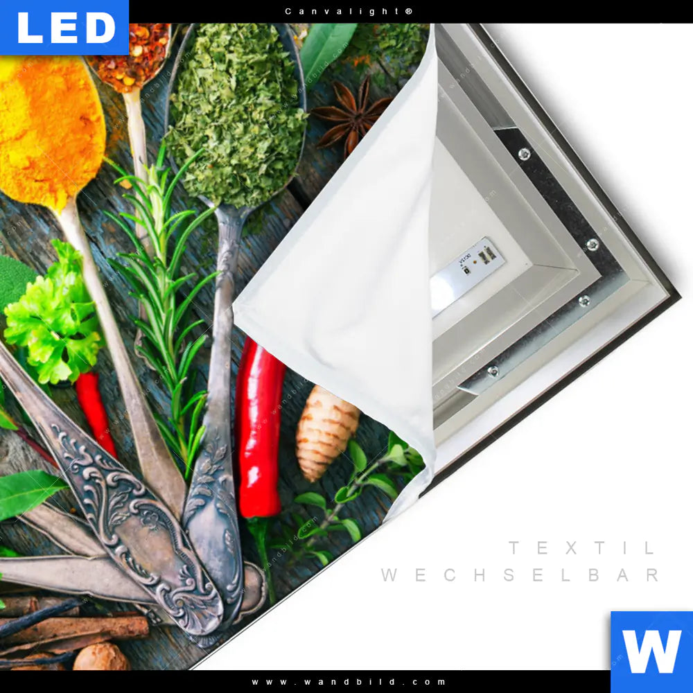 Canvalight® TEX Leuchtbild | Löffel mit Kräutern und Gewürzen | Querformat
