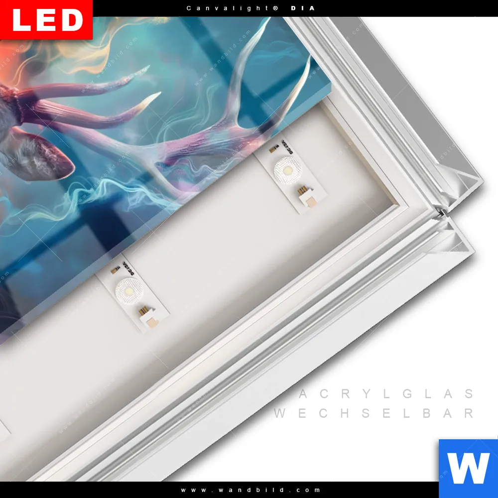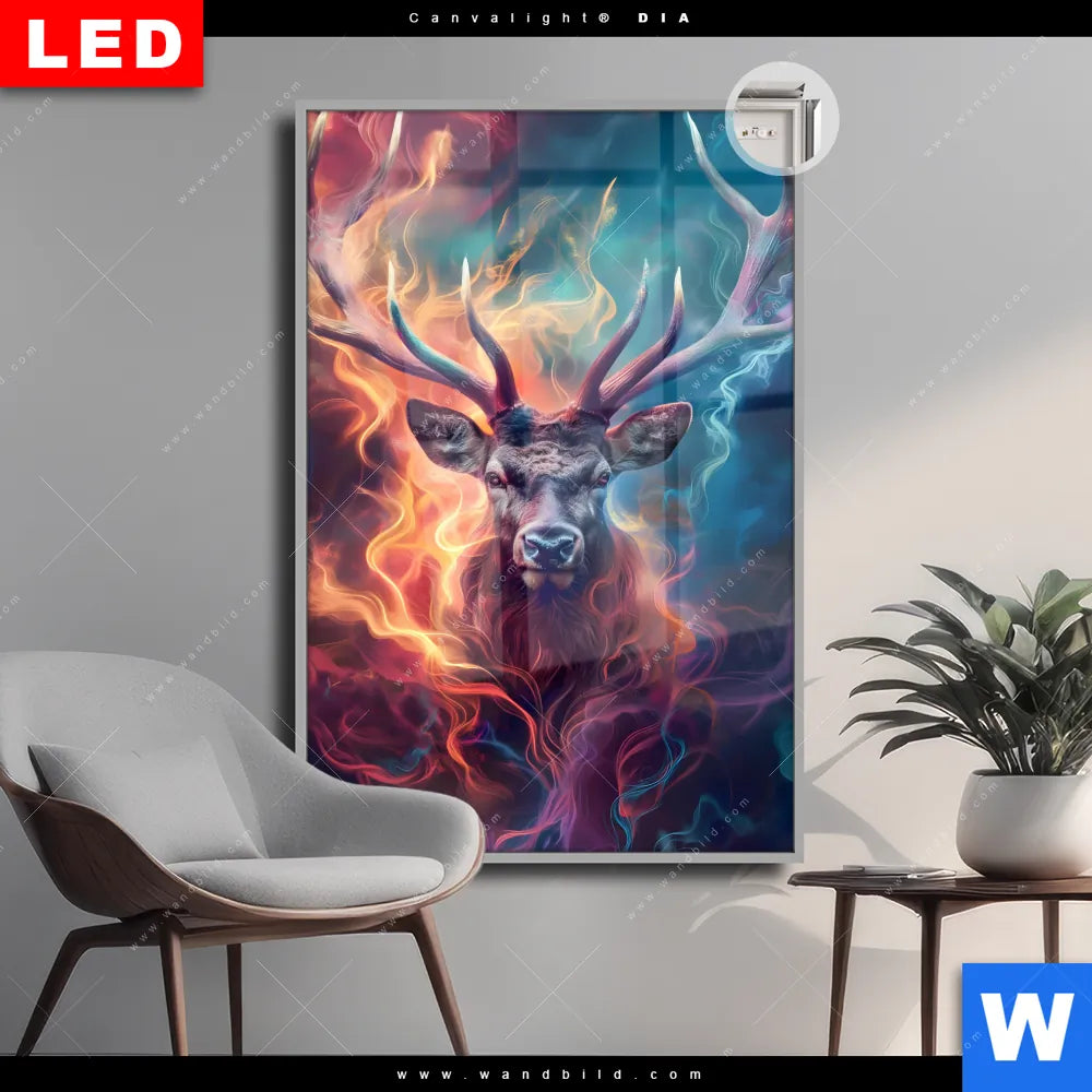 Canvalight® DIA Leuchtbild | Bunter Hirsch in Flammen | Hochformat