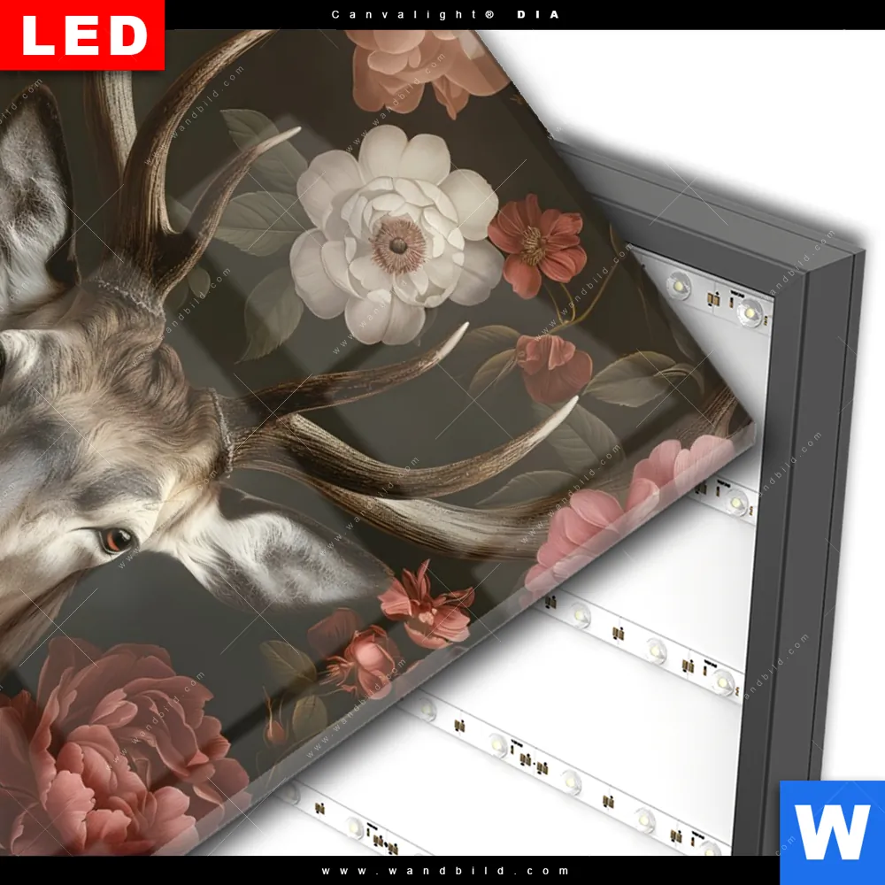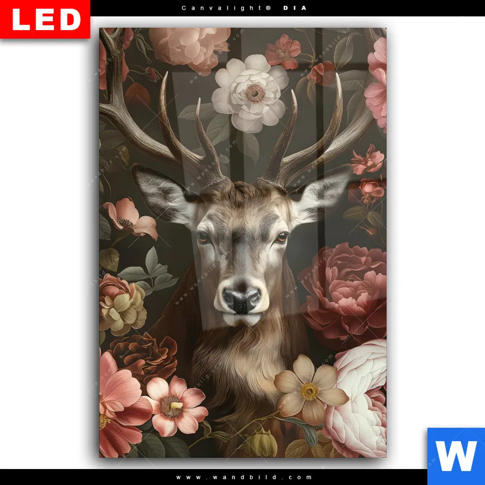 Wechselmotiv Acrylglas Canvalight® DIA | Friedlicher Hirsch und Blüten | Hochformat