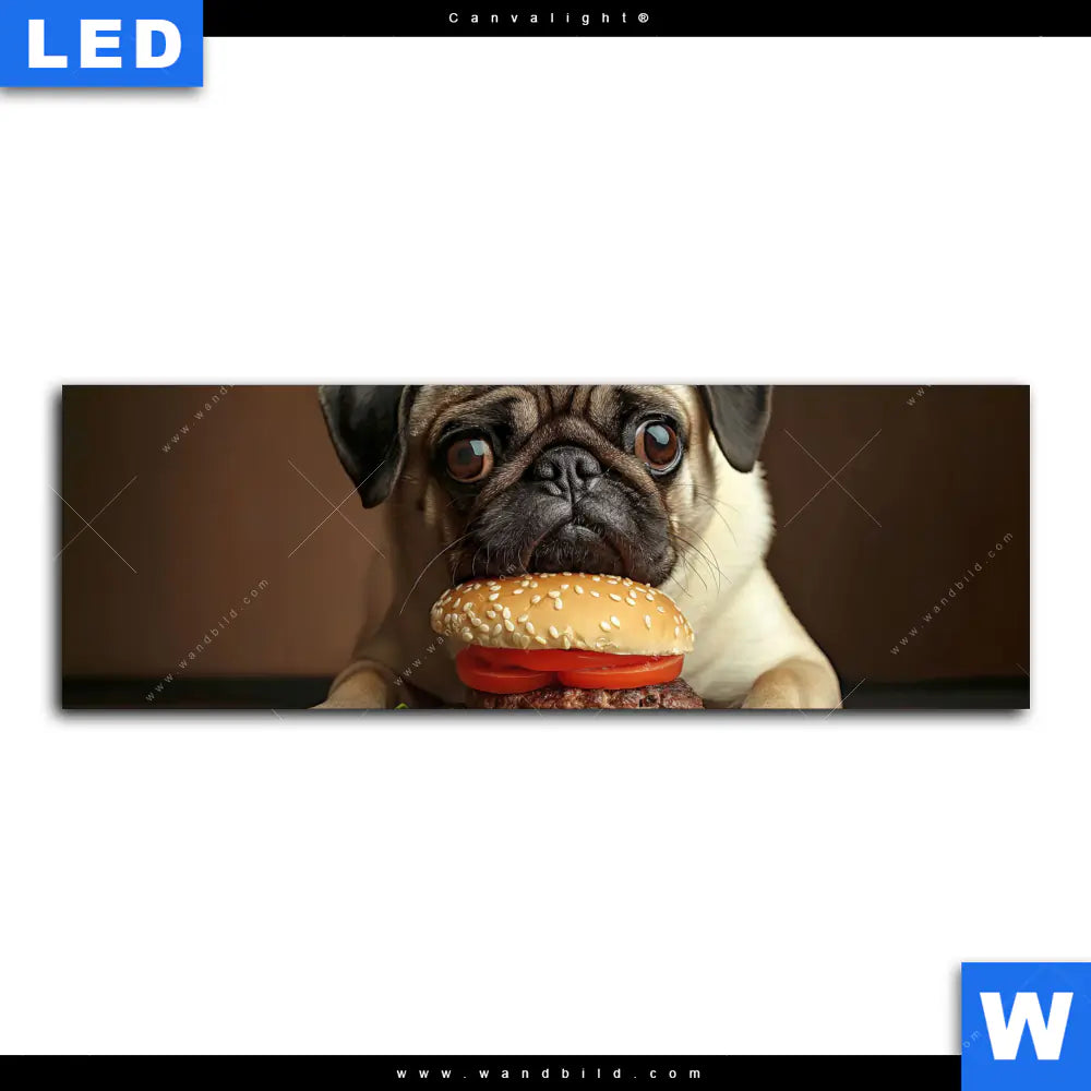 Canvalight® Leuchtbild | Mops mit Cheeseburger | Panorama