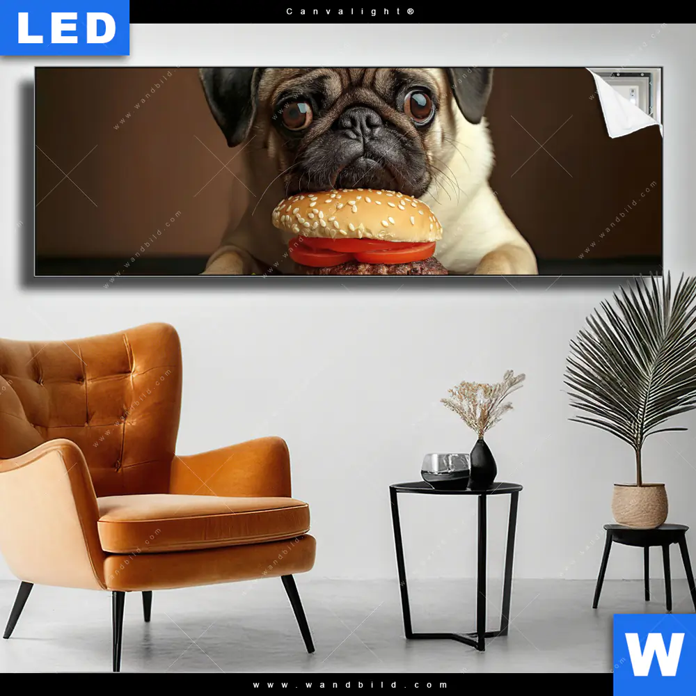 Canvalight® TEX Leuchtbild | Mops mit Cheeseburger | Panorama