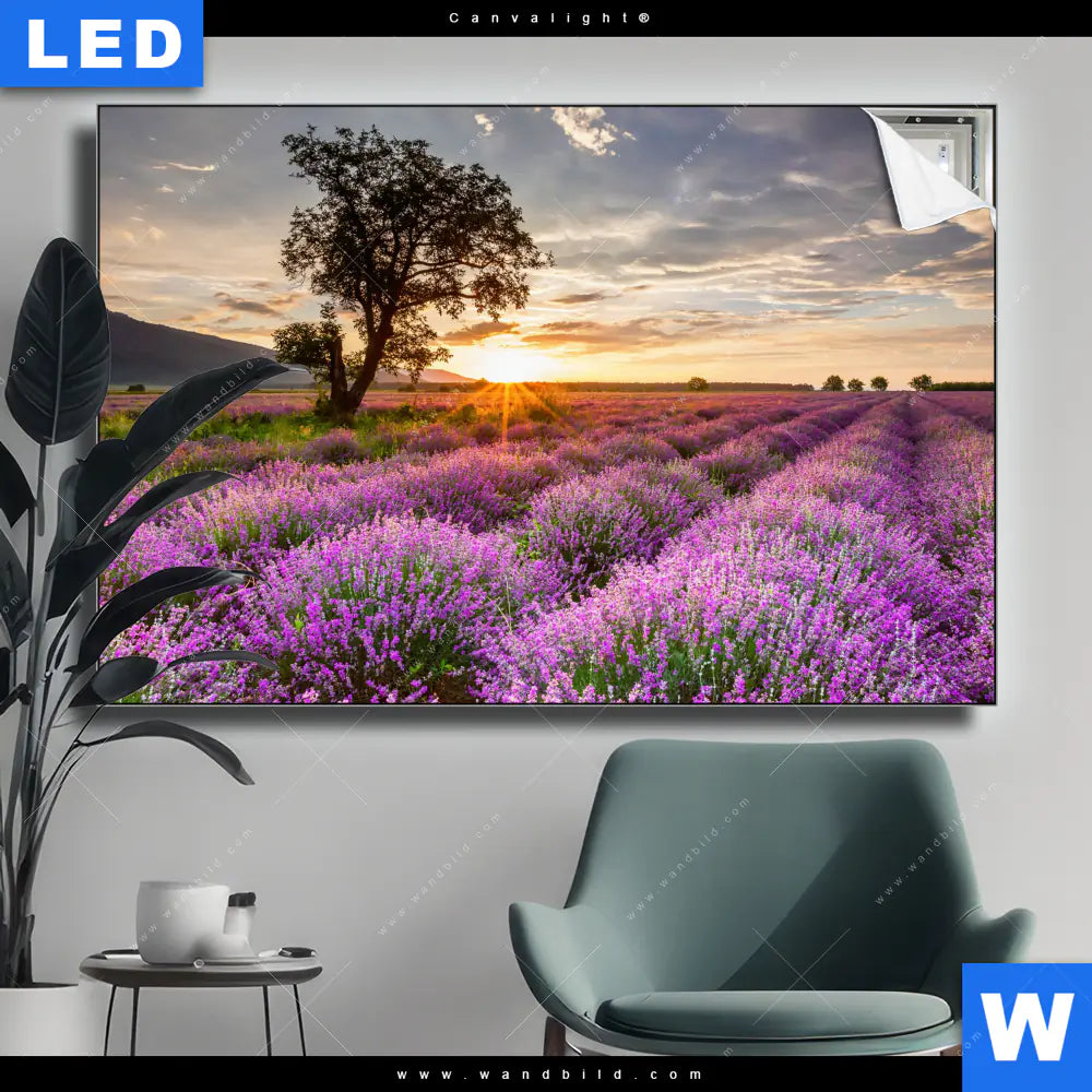 Canvalight® TEX Leuchtbild | Sonnenaufgang im Lavendelfeld | Querformat