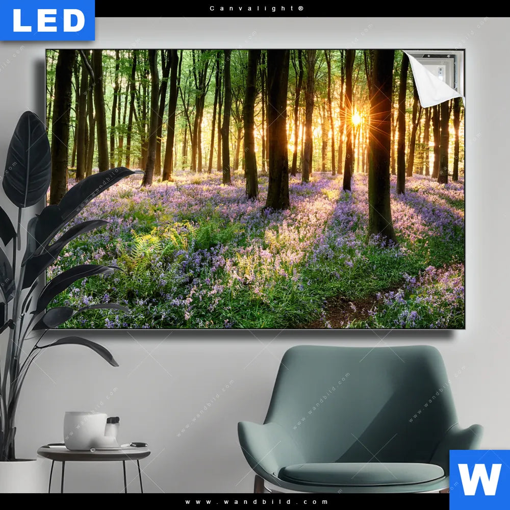 Canvalight® TEX Leuchtbild | Blühender Wald bei Sonnenaufgang | Querformat