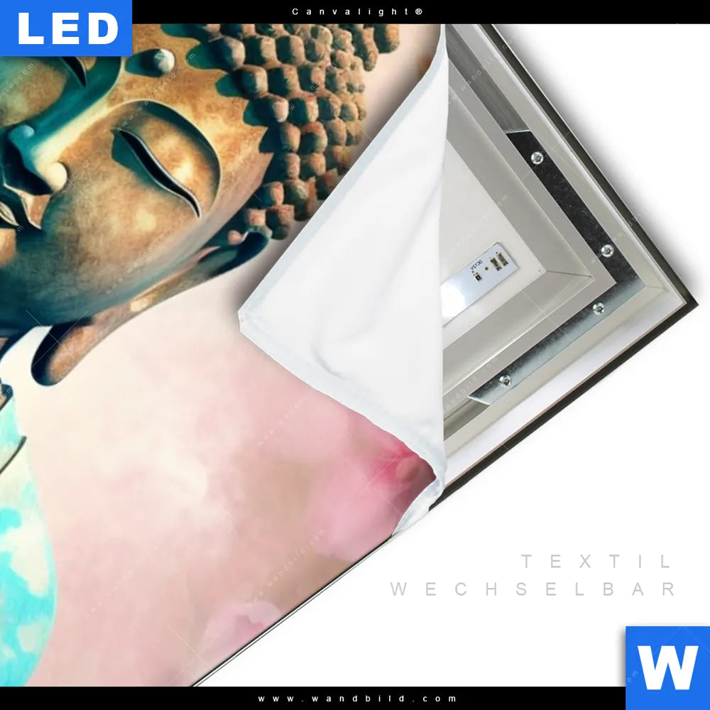 LED-Textilrahmen-Bild mit austauschbarem Buddha - Feng Shui, Blumen - Botanik Textil-Druck (Wechselbild)