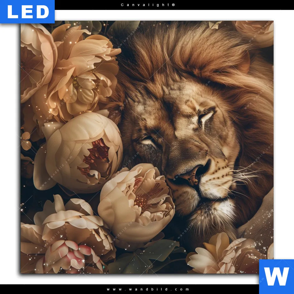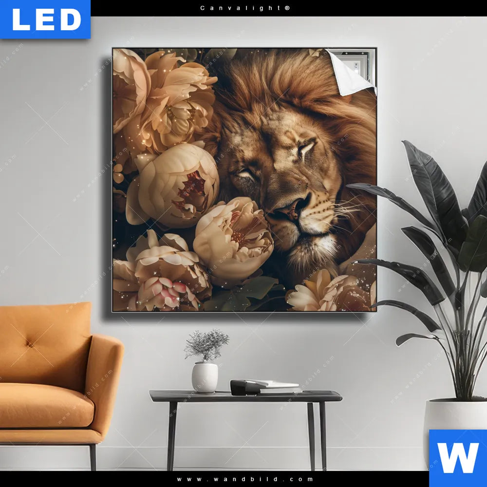 Canvalight® TEX Leuchtbild | Löwe schläft in Blüten | Quadrat