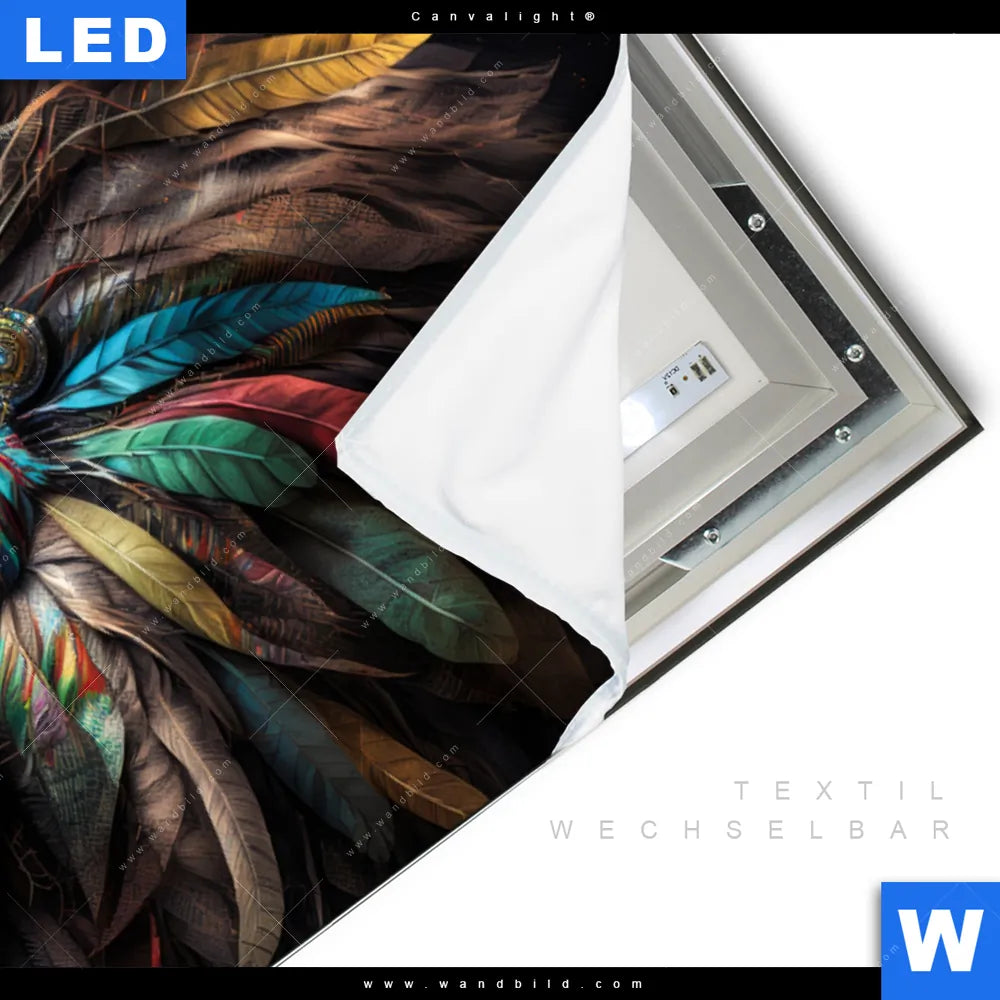 Canvalight® TEX Leuchtbild | Löwenkopf mit bunten Federn | Querformat