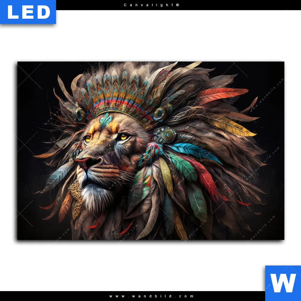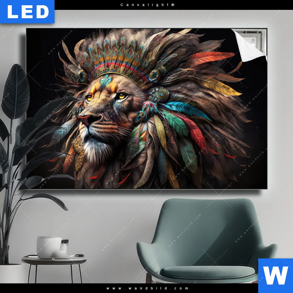 Canvalight® Leuchtbild | Löwenkopf mit bunten Federn | Querformat