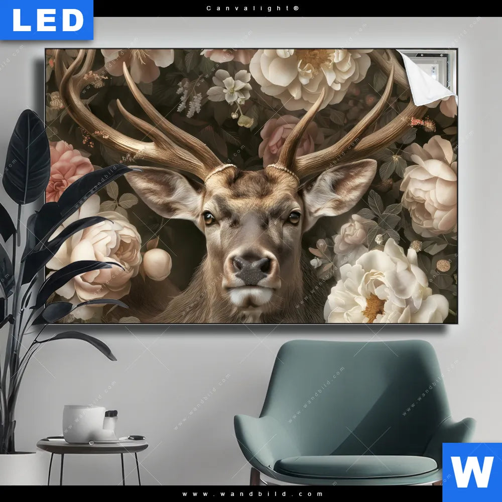 Canvalight® TEX Leuchtbild | Romantischer Hirsch mit Blumen | Querformat