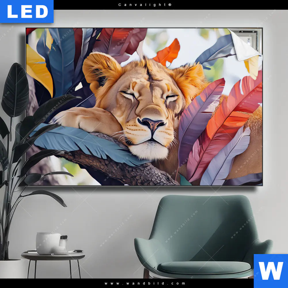 Canvalight® TEX Leuchtbild | Träumender Löwe im Baum | Querformat