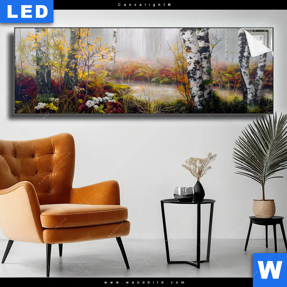 Canvalight® TEX Leuchtbild | Naturidylle - Birken im Nebel | Panorama
