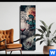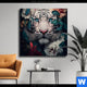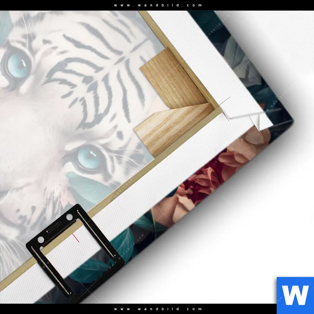 Leinwandbild | Weißer Tiger mit blauen Augen zwischen Blumen | Hochformat