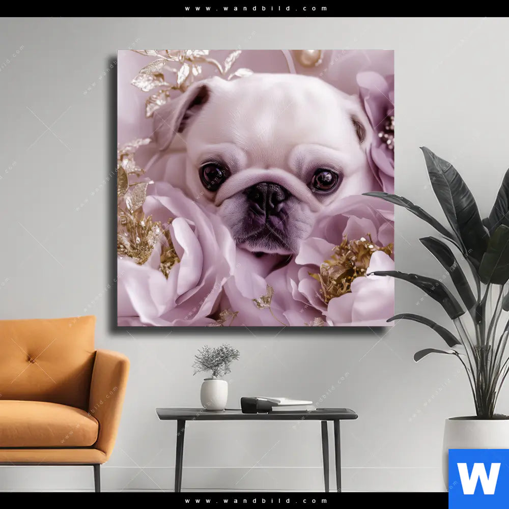 Leinwandbild | Mops im Blütenmeer | Quadrat