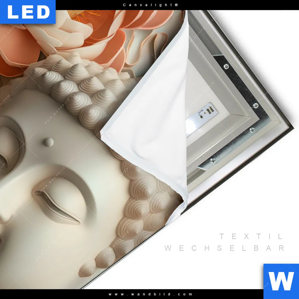 LED-Textilrahmen-Bild mit austauschbarem Buddha - Feng Shui, Blumen - Botanik Textil-Druck (Wechselbild)
