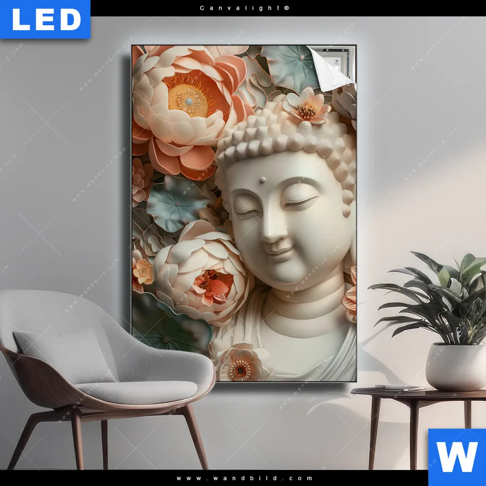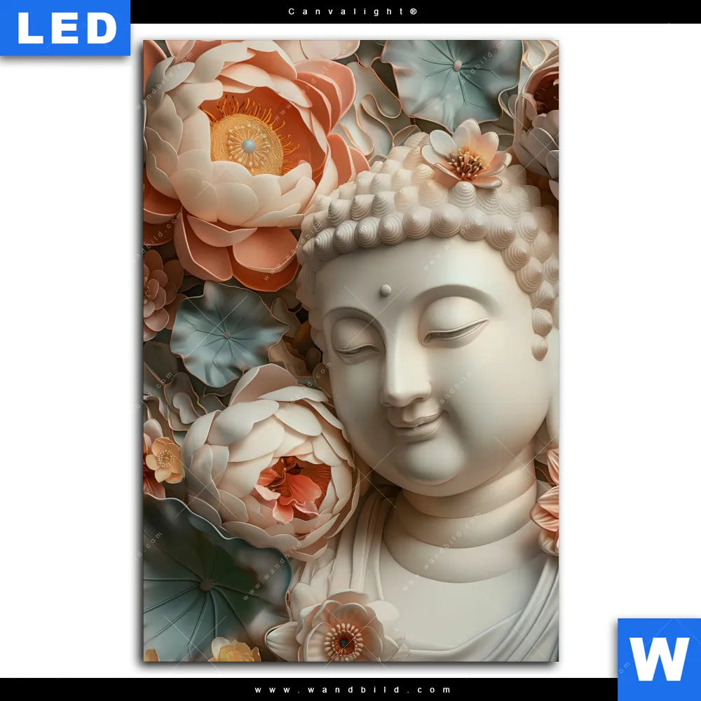 Canvalight® TEX Leuchtbild | Buddha-Statue mit Blüten | Hochformat