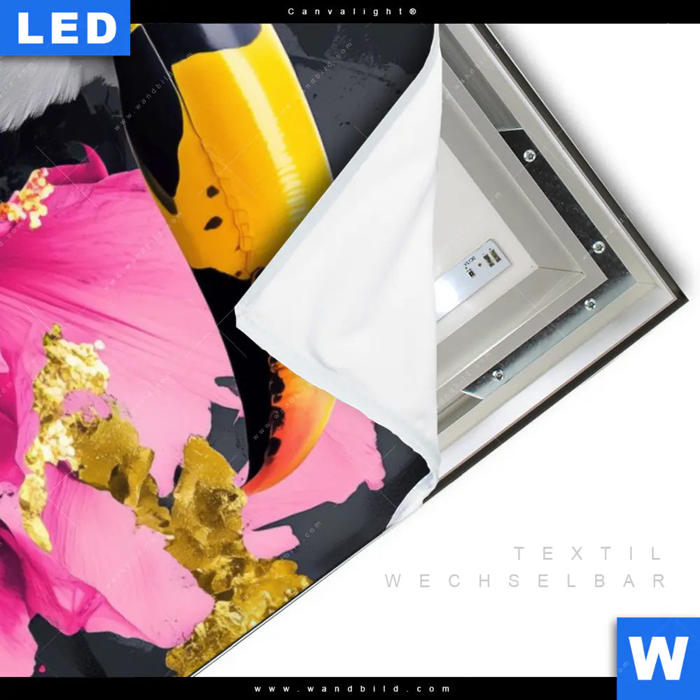 Canvalight® TEX Leuchtbild | Exotischer Tukan mit Blüten | Hochformat
