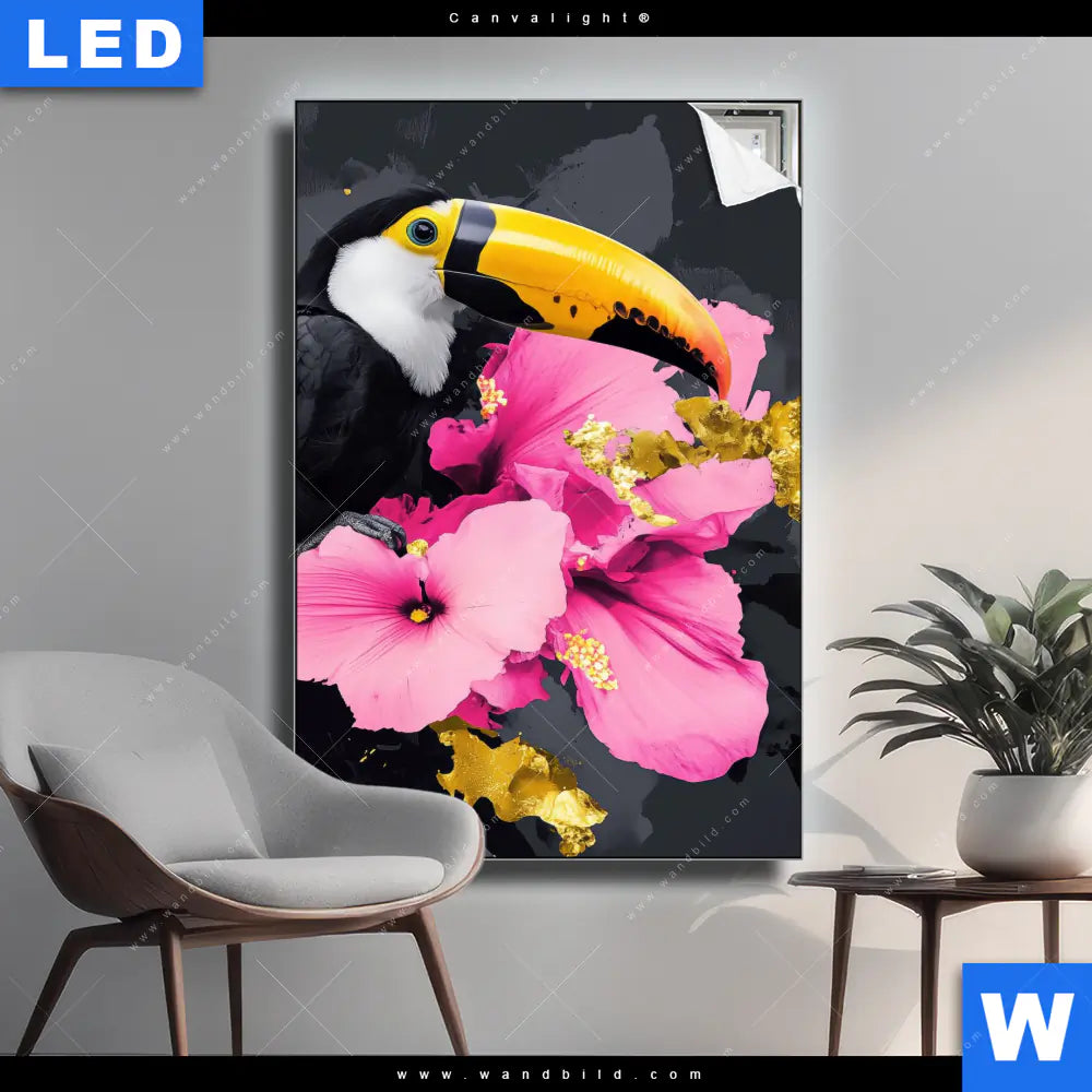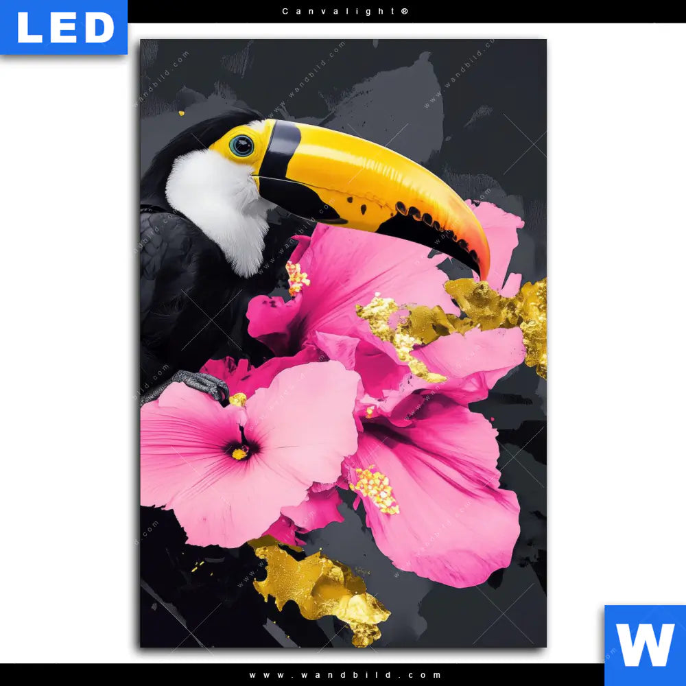 Canvalight® Leuchtbild | Exotischer Tukan mit Blüten | Hochformat