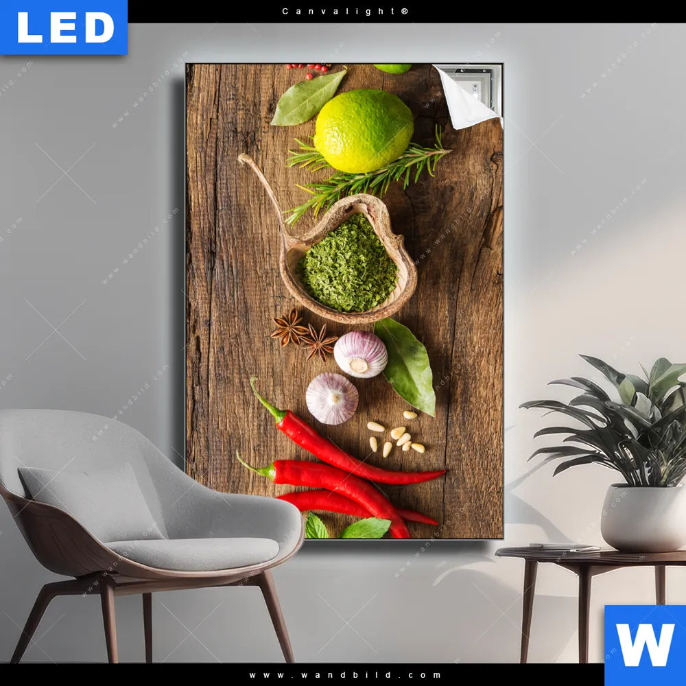 Canvalight® TEX Leuchtbild | Gewürze & Kräuter auf Holz | Hochformat