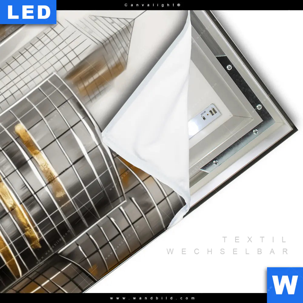 Canvalight® TEX Leuchtbild | Goldene Skyline Vision | Hochformat