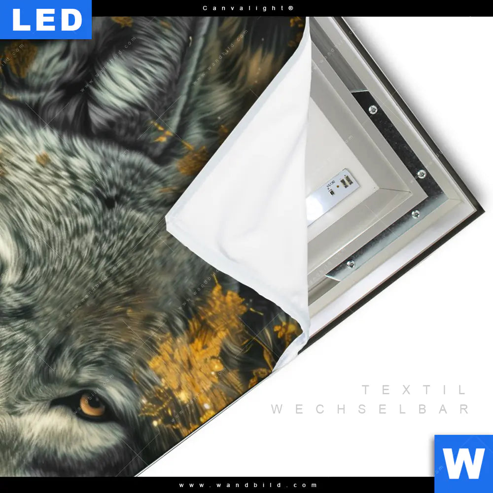 Canvalight® TEX Leuchtbild | Goldener Wolfblick | Hochformat
