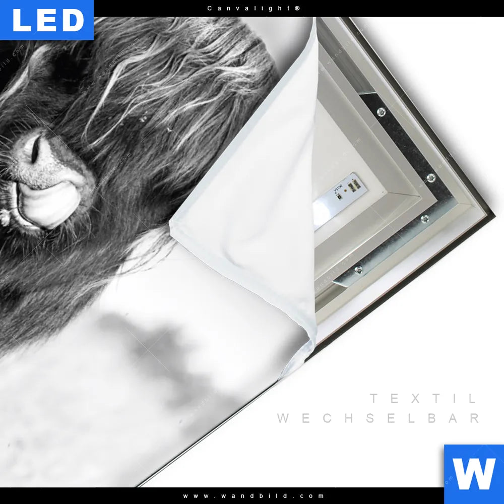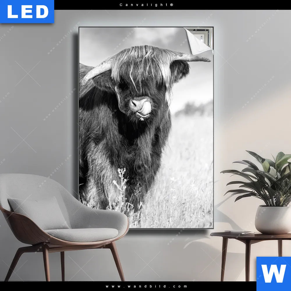 Canvalight® TEX Leuchtbild | Hochlandkuh auf einer Wiese | Hochformat