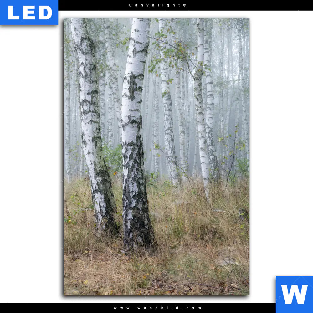 Canvalight® Leuchtbild | Nebliger Morgen im Birkenwald | Hochformat