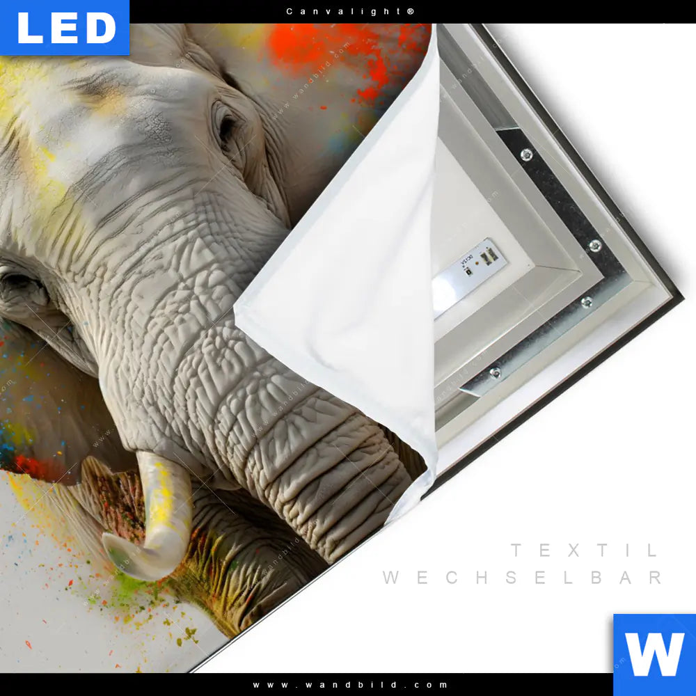 Canvalight® TEX Leuchtbild | Farbenexplosion mit Elefant | Quadrat