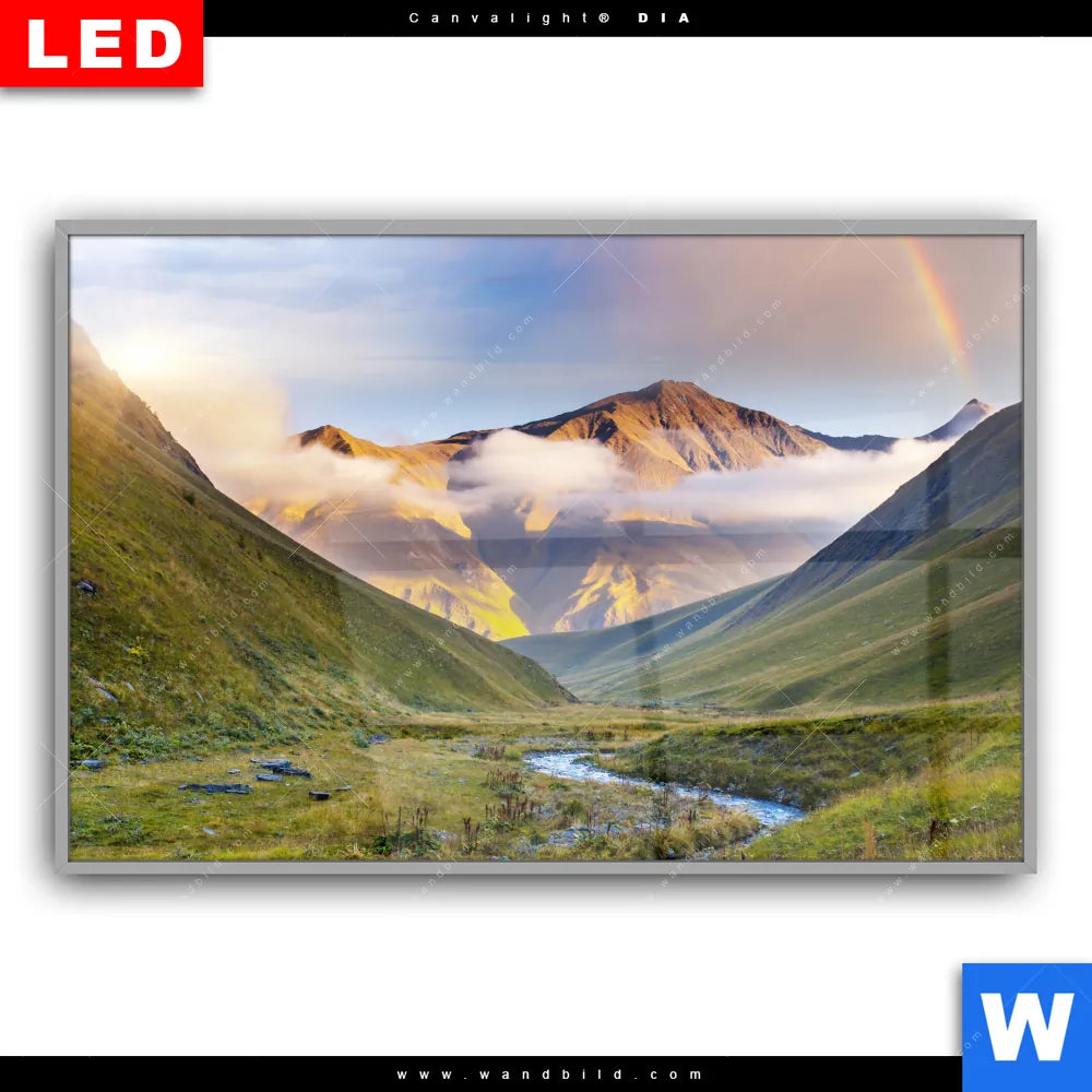 Canvalight® DIA Leuchtbild | Nebel und Regenbogen zwischen den Bergen | Querformat