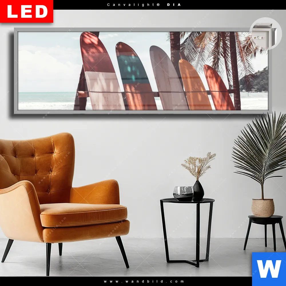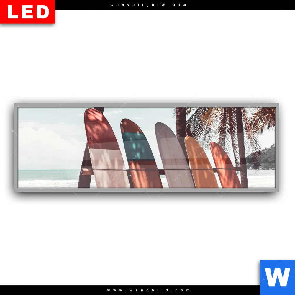 Canvalight® DIA Leuchtbild | Surfbretter und Palmen | Panorama