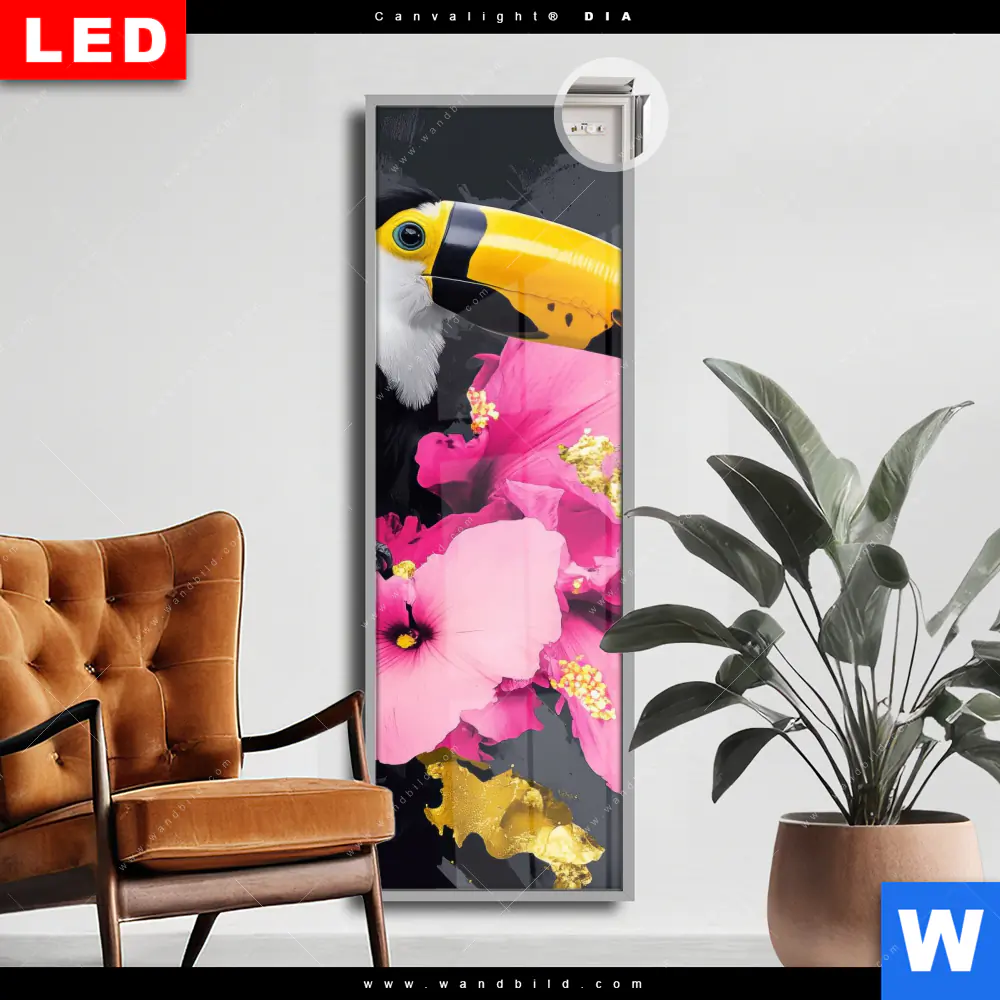 Leuchtbild Acrylglas Canvalight® DIA | Exotischer Tukan mit Blüten | Schmal