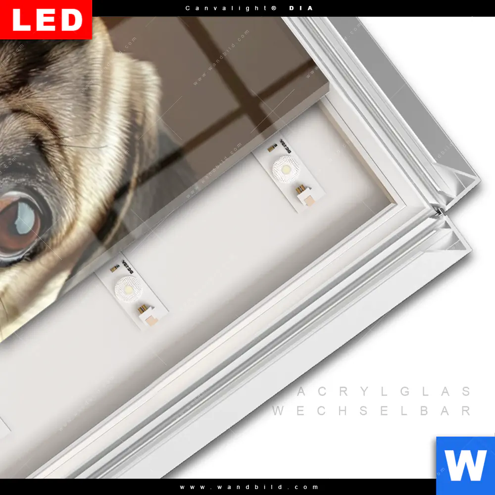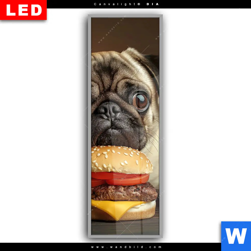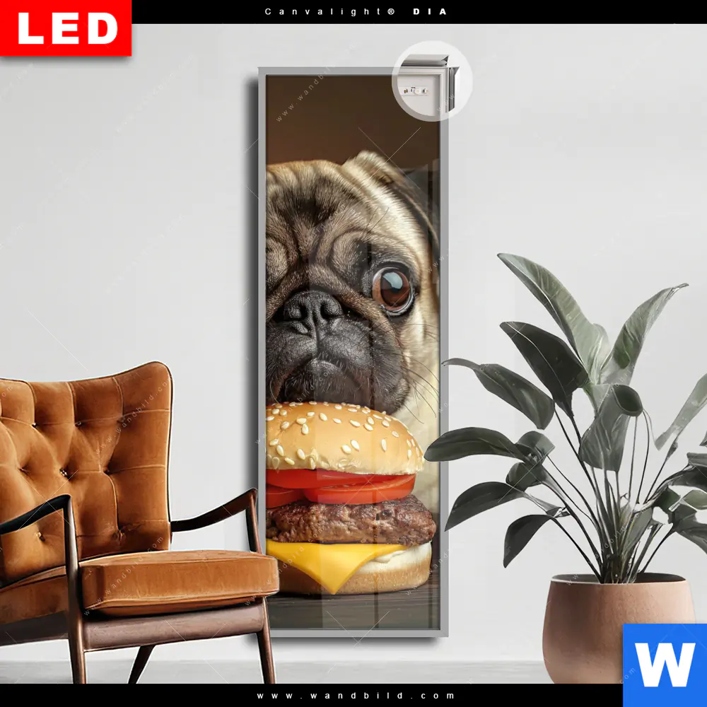 Canvalight® DIA Leuchtbild | Mops mit Cheeseburger | Schmal