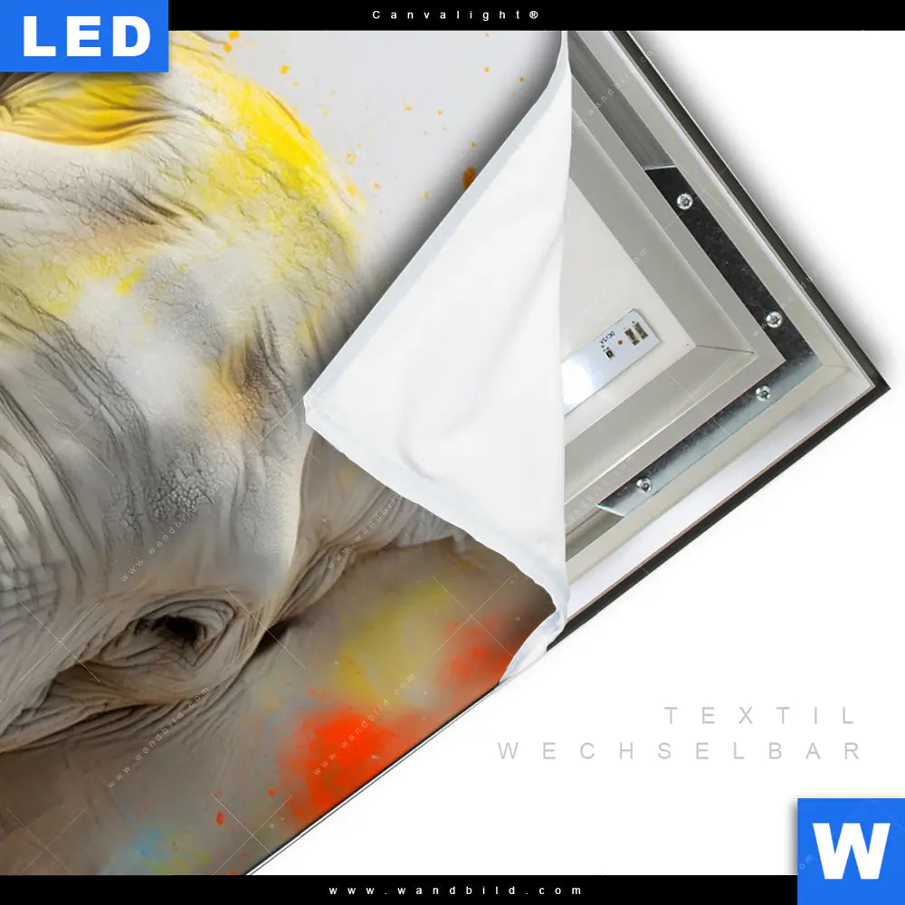 Canvalight® TEX Leuchtbild | Farbenexplosion mit Elefant | Hochformat