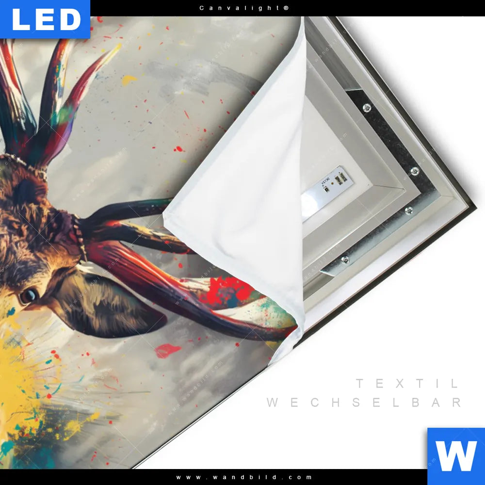 Canvalight® TEX Leuchtbild | Kreativer Hirsch mit Farbspritzern | Hochformat
