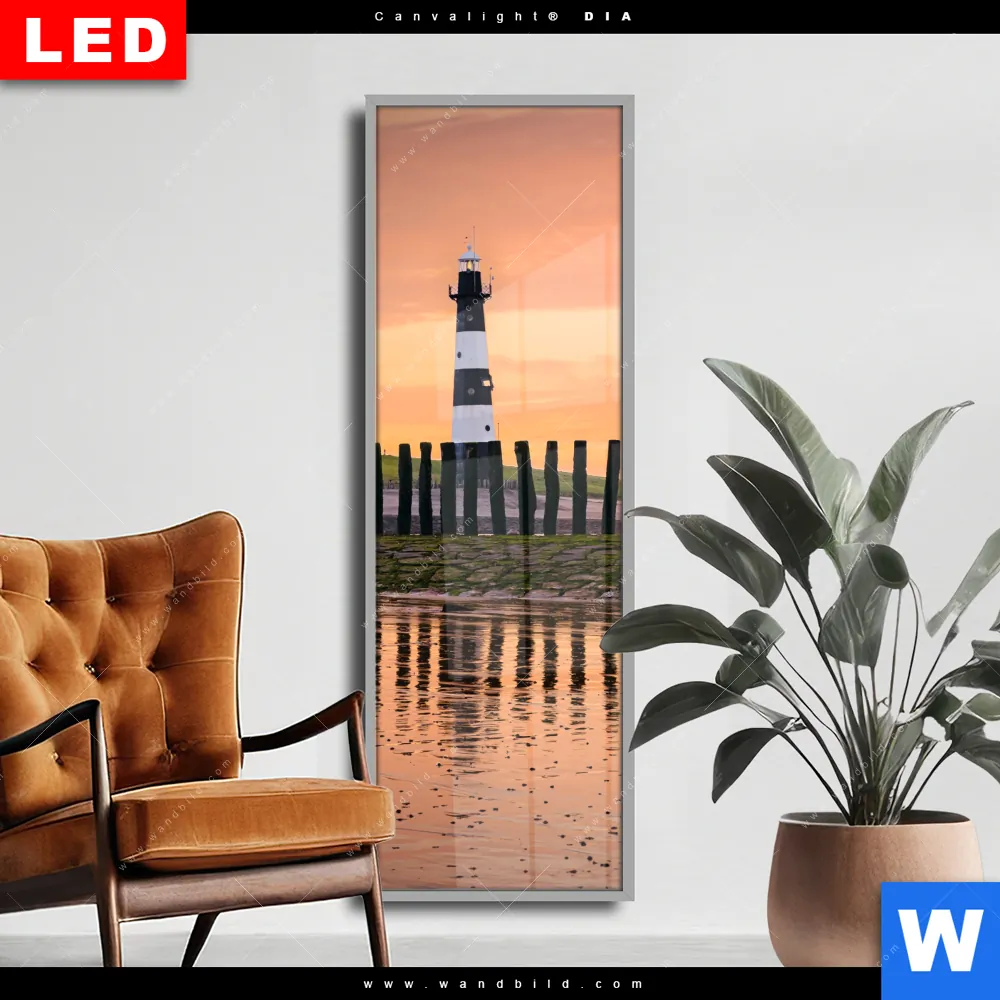 Wechselmotiv Acrylglas Canvalight® DIA | Leuchtturm bei Sonnenuntergang | Schmal