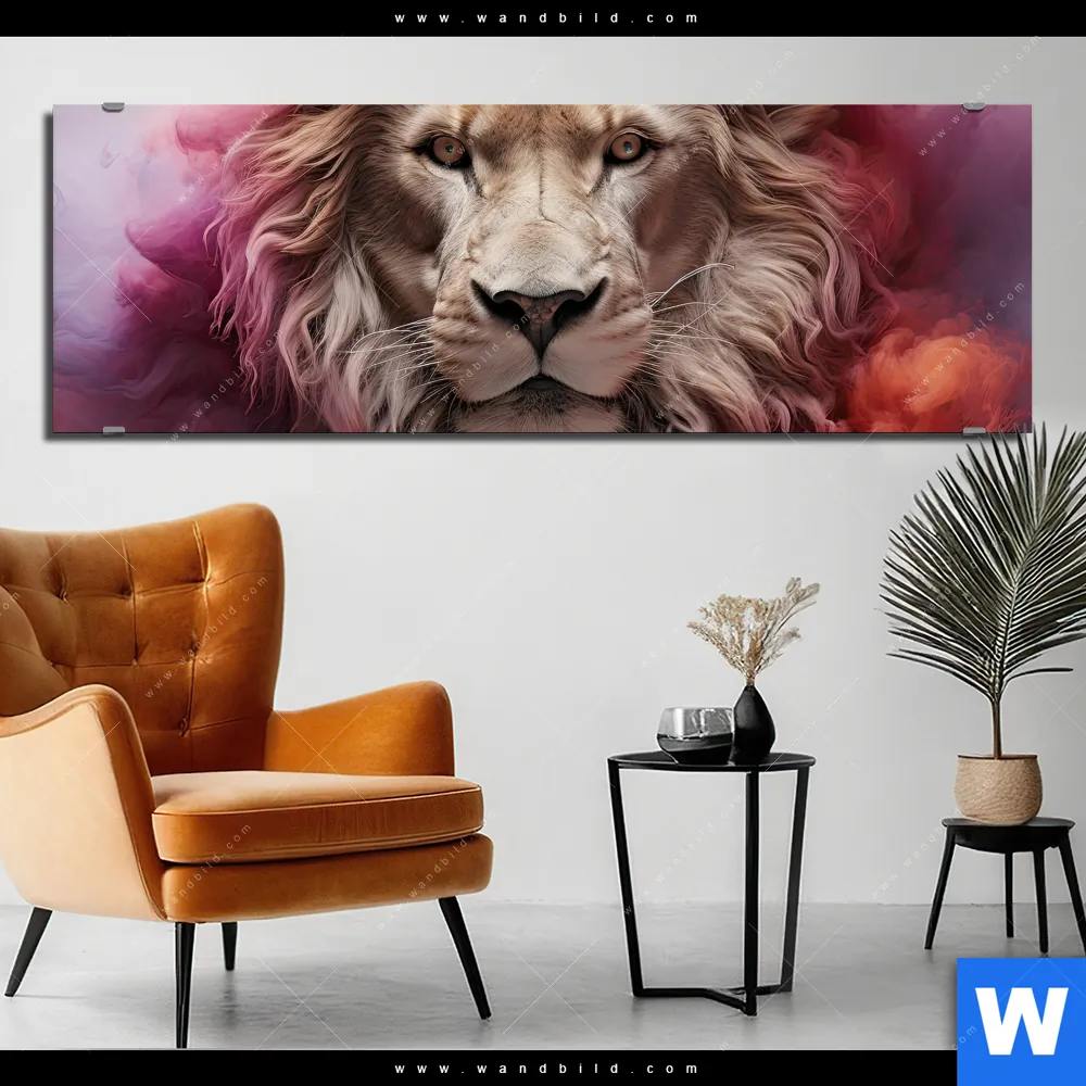 Alu-Dibond Bild | Löwengesicht in buntem Rauch | Panorama