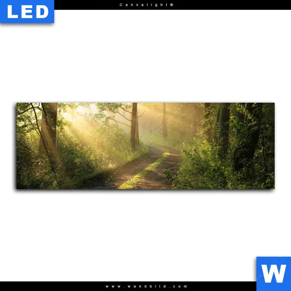 Canvalight® TEX Leuchtbild | Morgenspaziergang im nebeligem Wald | Panorama
