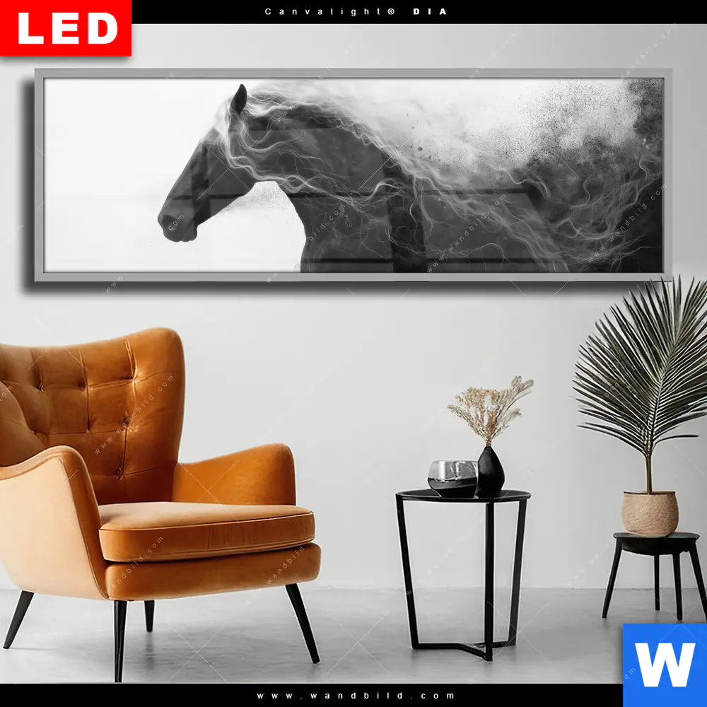 Wechselmotiv Acrylglas Canvalight® DIA | Schwarzes Pferd voller Energie | Panorama