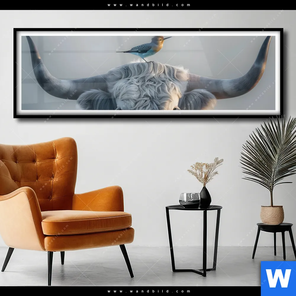 Poster | Hochlandrind & bunter Vogel | Panorama