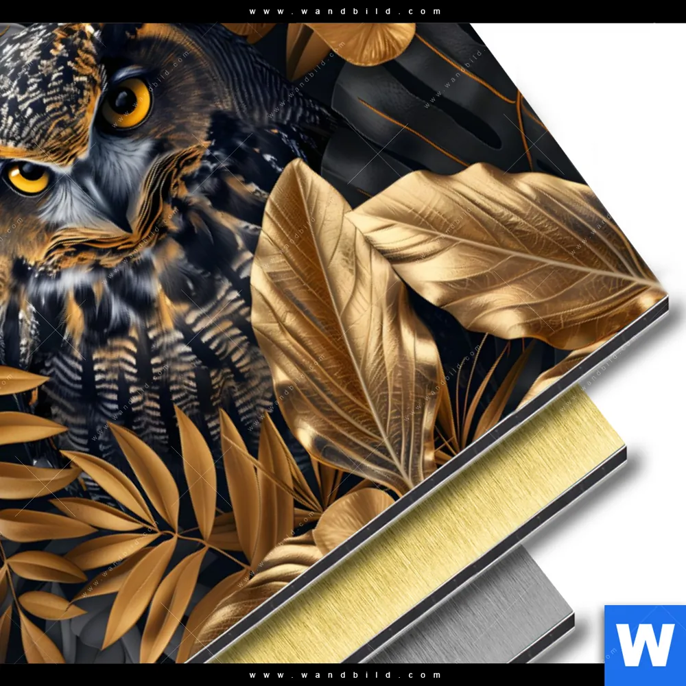 Aluminiumbild gebürstet | Eule und goldene Blätter | Querformat