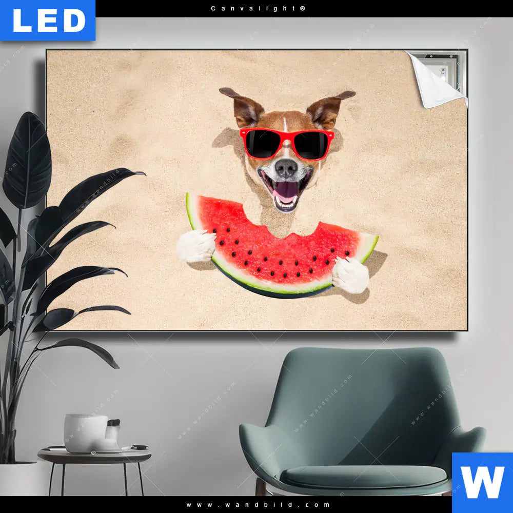 Canvalight® TEX Leuchtbild | Lustiger Hund am Strand | Querformat