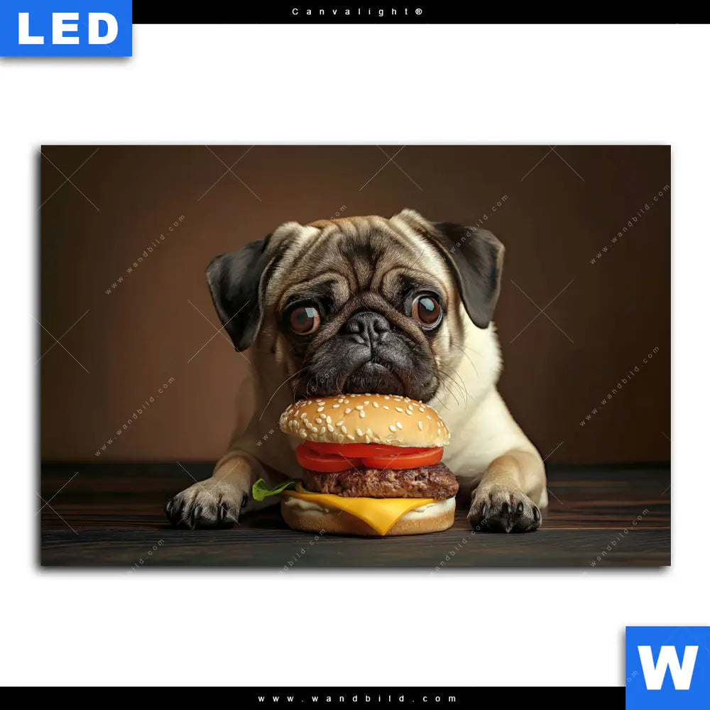 Canvalight® Leuchtbild | Mops mit Cheeseburger | Querformat