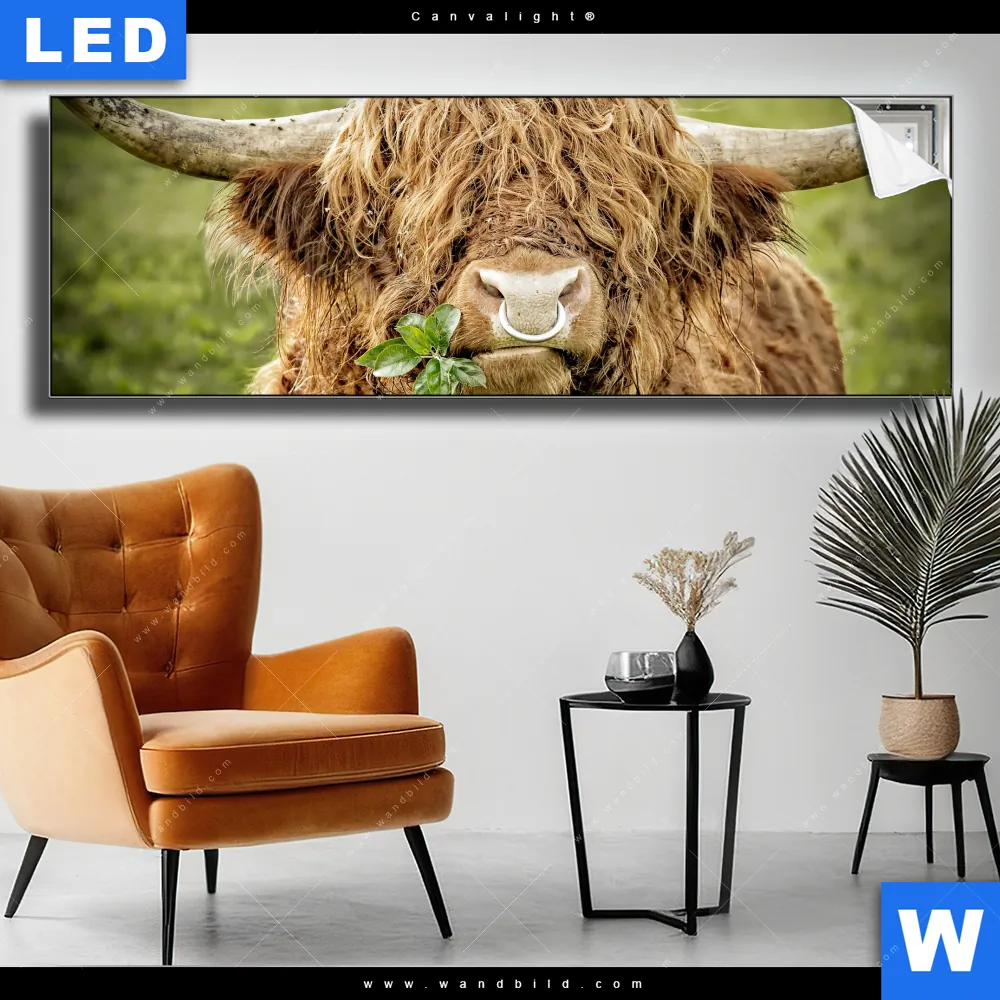 Canvalight® TEX Leuchtbild | Hochland-Rind mit Nasenring | Panorama